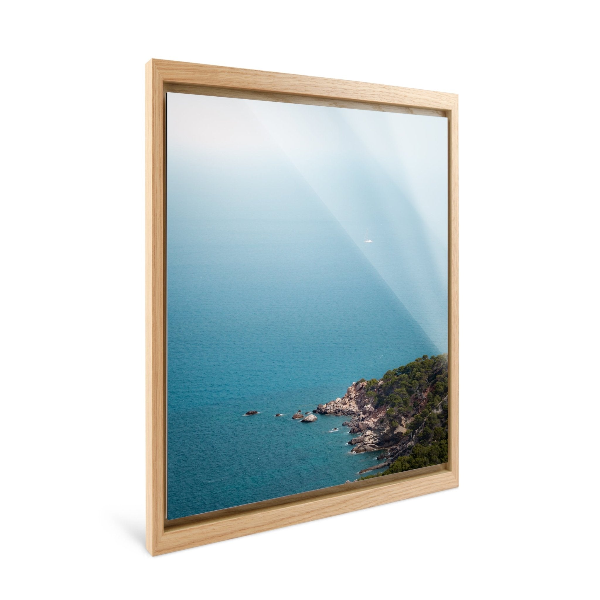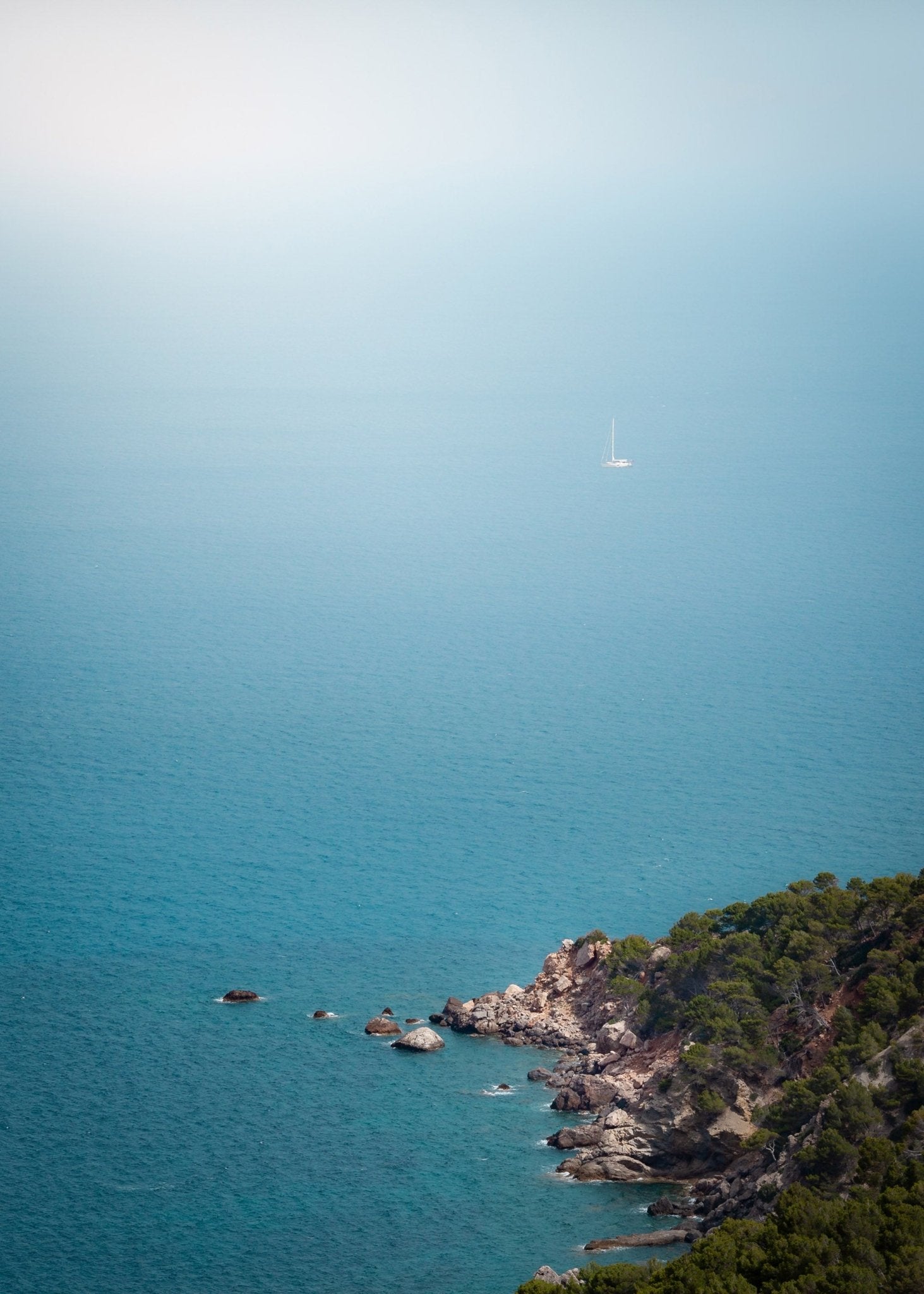 Escape into the tranquil vastness of the sea with this serene coastal print. The gentle gradient of blue extends infinitely, creating a dreamlike sense of calm and freedom. A lone sailboat drifts effortlessly in the open waters, embodying the essence of solitude and exploration. Below, the rugged coastline, lush with greenery, contrasts the endless ocean, adding depth and texture. This minimalist yet captivating seascape is a perfect addition to any space, inspiring wanderlust and peace.